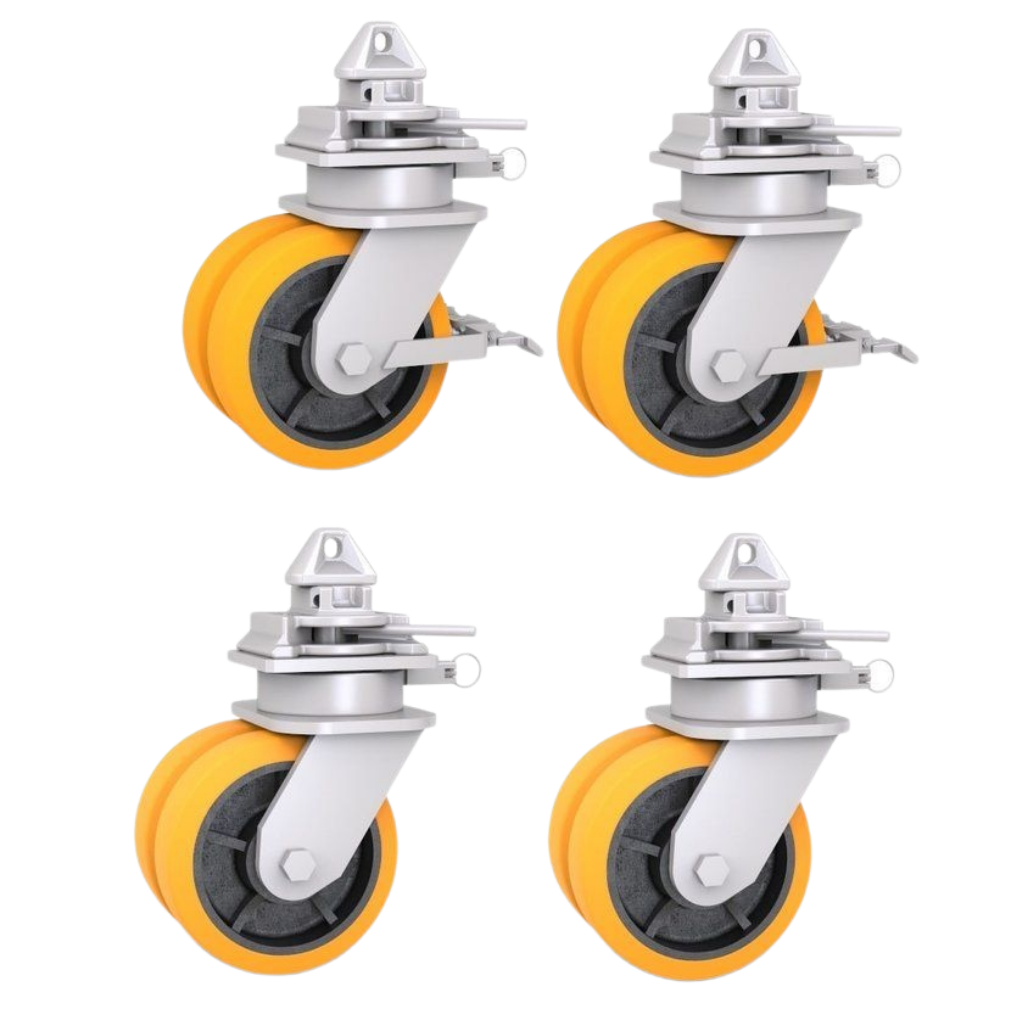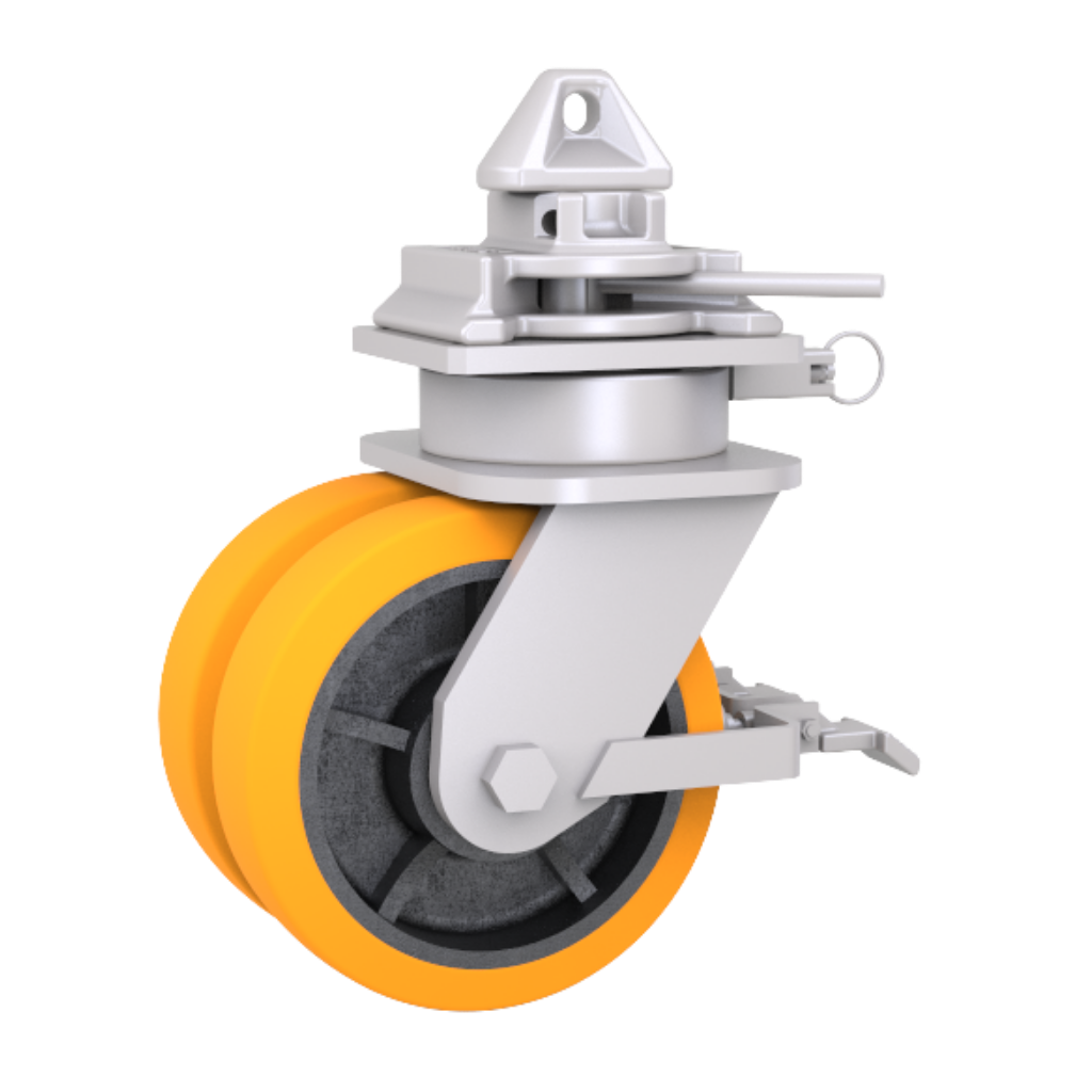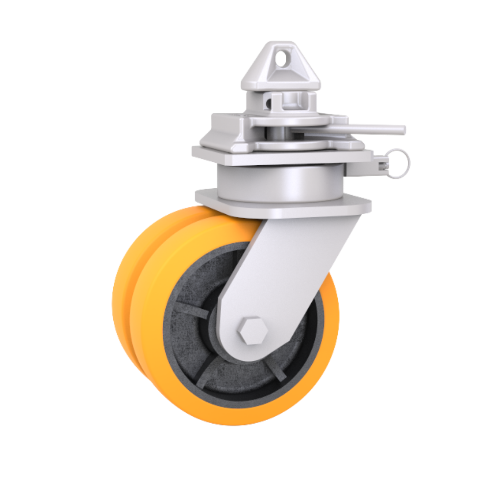Elk zwenkwielsysteem is voorzien van een draaivergrendeling en is uitgerust met twee polyurethaanwielen voor maximale stabiliteit en veiligheid. De wielen hebben een diameter van 250 mm en een breedte van 63 mm, met gietijzeren naven en polyurethaan loopvlakken. Dit ontwerp zorgt voor soepel rollen en de mogelijkheid om tegelijkertijd zware lasten te dragen.