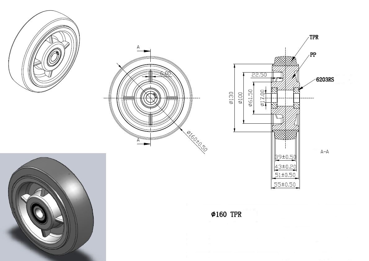 wiel, Ø 160, grijze niet-strepende thermoplastische rubberband, 200KG